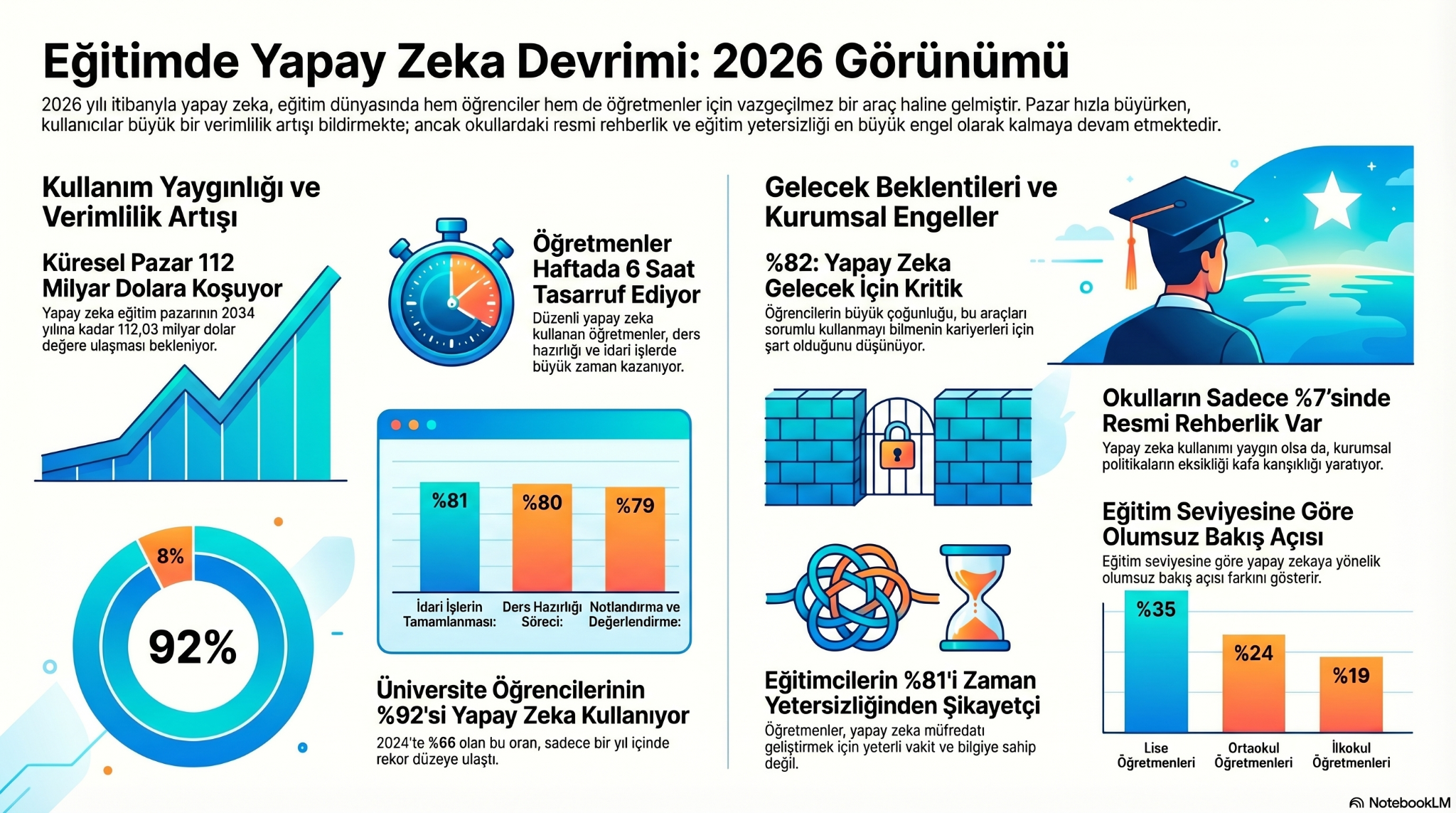 2026 yılı itibarıyla yapay zeka, eğitim dünyasında hem öğrenciler hem de öğretmenler için vazgeçilmez bir araç haline geldi. Yayınlanan son verilere göre, kullanım oranları hızla artarken, kurumsal altyapı ve rehberlik eksiklikleri önemli bir sorun olarak öne çıkıyor.