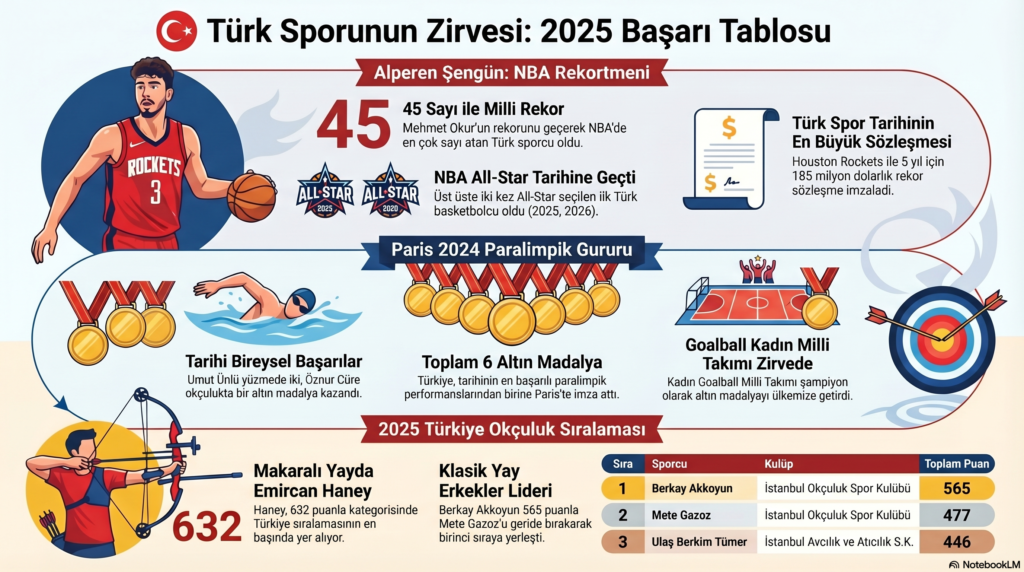 2025 ve 2026 yılları, Türk sporunun hem bireysel hem de takım bazında uluslararası arenada “altın çağına” tanıklık ettiği bir dönem olarak kayıtlara geçmiştir. Kaynaklar, bu başarıların arkasındaki sayısal verileri ve sporcuların kırdığı tarihi rekorları şu şekilde detaylandırmaktadır: Basketbolda Alperen Şengün Dominasyonu NBA parkelerinde Houston Rockets formasıyla mücadele eden Alperen Şengün, 5 yıl için imzaladığı 185 milyon dolarlık sözleşme ile Türk spor tarihinin en çok kazanan sporcusu unvanını elde etmiştir. Veriler, Şengün’ün sadece ekonomik değil, teknik anlamda da bir dünya devi olduğunu kanıtlamaktadır: NBA tarihinde 5000 sayı, 2500 ribaund ve 1000 asist barajına ulaşan en genç üçüncü oyuncu (LeBron James ve Giannis Antetokounmpo’dan sonra) olmuştur. 2025 ve 2026 yıllarında üst üste iki kez NBA All-Star seçilerek bu onura iki kez erişen ilk Türk basketbolcu olarak tarihe geçmiştir. 2025 Avrupa Basketbol Şampiyonası’nda (EuroBasket) milli takımı gümüş madalyaya taşırken, finalde Almanya karşısında 28 sayı üreterek maçın en skorer ismi olmuş ve turnuvanın “En İyi Beşi”ne seçilmiştir. NBA’de bir maçta 45 sayı atarak (San Antonio Spurs’e karşı), Mehmet Okur’un 43 sayılık rekorunu geride bırakmış ve bir maçta en çok sayı atan Türk oyuncu olmuştur. Filenin Sultanları: Dünya Sahnesinde İstatistiksel Üstünlük A Milli Kadın Voleybol Takımımız, 2025 yılında Dünya Şampiyonası’nda gümüş madalya kazanarak tarihindeki en büyük başarıyı elde etmiştir. Takımın başarısı, 2025 Milletler Ligi (VNL) verilerine de doğrudan yansımıştır: Melissa Vargas, Dünya Şampiyonası finalinde Brezilya’ya karşı 31 sayı üreterek sahanın en skorer ismi olmuştur. VNL 2025 istatistiklerine göre takım toplamda 552 sayı ve 85 blok üretmiştir. Bireysel verilerde Alexia Carutasu 91 sayı ile en skorer, Deniz Uyanık 13 blok ile en iyi savunmacı ve Eylül Akarçeşme %77 pozitif manşet oranıyla en iyi karşılayıcı olarak öne çıkmıştır. Bireysel Sporlarda Zirve İsimler Motor Sporları: Toprak Razgatlıoğlu, 2025 Dünya Superbike Şampiyonası’nda sezonu 616 puanla lider tamamlayarak kariyerinin üçüncü dünya şampiyonluğunu ilan etmiştir. Cimnastik: Ferhat Arıcan, Artistik Cimnastik Dünya Challenge Kupası’nda paralel bar finalinde altın madalya kazanmıştır. Okçuluk: 2025 Türkiye sıralamasında Klasik Yay Erkeklerde Berkay Akkoyun 565 puanla birinci, Mete Gazoz ise 477 puanla ikinci sırada yer almaktadır. Kadınlarda ise Dünya Yenihayat 558 puanla zirvededir. Yüzme: Kuzey Tunçelli, 1500 metre serbest stilde Gençler Dünya Rekoru’nu geliştirmiş ve bu mesafede final gören en genç sporculardan biri olmuştur. Boks: Busenaz Sürmeneli, 2025 Dünya Kadınlar Boks Şampiyonası finalinde rakibini 5-0 yenerek üçüncü kez dünya şampiyonu olmuştur. Paralimpik Başarılar ve Diğer Branşlar Türkiye, 2025 yılı itibarıyla paralimpik branşlarda da yükselişini sürdürmektedir. Özellikle Paris 2024 sonrası verilerde; para yüzmede Umut Ünlü (2 altın), para atletizmde Fatma Damla Altın, okçulukta Öznur Cüre ve para tekvandoda Mahmut Bozteke altın madalyalı isimler olarak dikkat çekmektedir. Ayrıca Kadın Goalball Milli Takımı, finalde İsrail’i 10-3 yenerek dördüncü kez Avrupa şampiyonu olmuştur. Milliyet Yılın Sporcusu Ödülleri’nde Alperen Şengün “Yılın Sporcusu”, Melissa Vargas “Yılın Kadın Sporcusu” ve Filenin Sultanları “Yılın Takımı” seçilerek bu veri temelli başarılarını ödüllerle taçlandırmışlardır. (Özel Haber) Veri Kaynak Google Google Google Google 12.04.2026-14:20 Yazı gezinmesi Corendon Alanyaspor–Trabzonspor maçının ilk 11’leri açıklandı Fenerbahçe, Çaykur Rizespor maçının hazırlıklarına başladı!