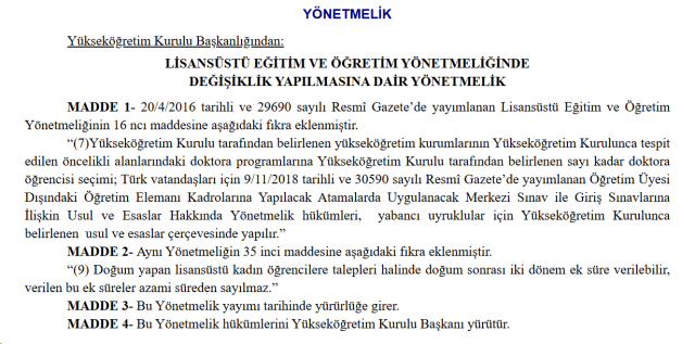 DOĞUM YAPAN LİSANSÜSTÜ ÖĞRENCİLERİNE 2 DÖNEM EK SÜREYönetmelikte yapılan bir diğer değişiklikle, doğum yapan kadın lisansüstü öğrencilere yeni bir hak tanındı. Talep etmeleri halinde doğum sonrası iki dönem ek süre verilecek ve bu ek süreler, lisansüstü eğitimdeki azami süre hesabına dahil edilmeyecek.